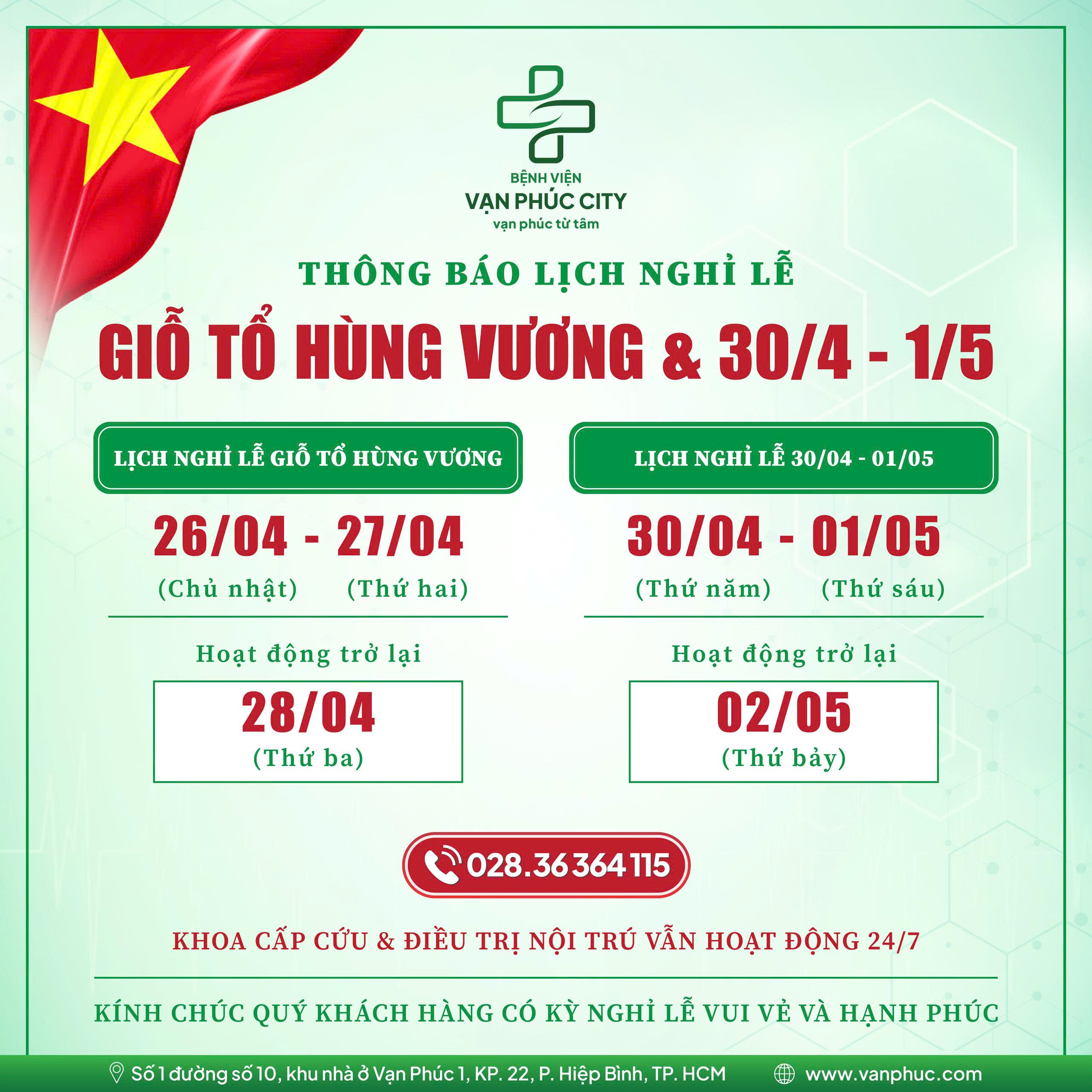 Bệnh viện Vạn Phúc City xin thông báo đến Quý khách hàng lịch hoạt động trong các kỳ nghỉ lễ sắp tới như sau: