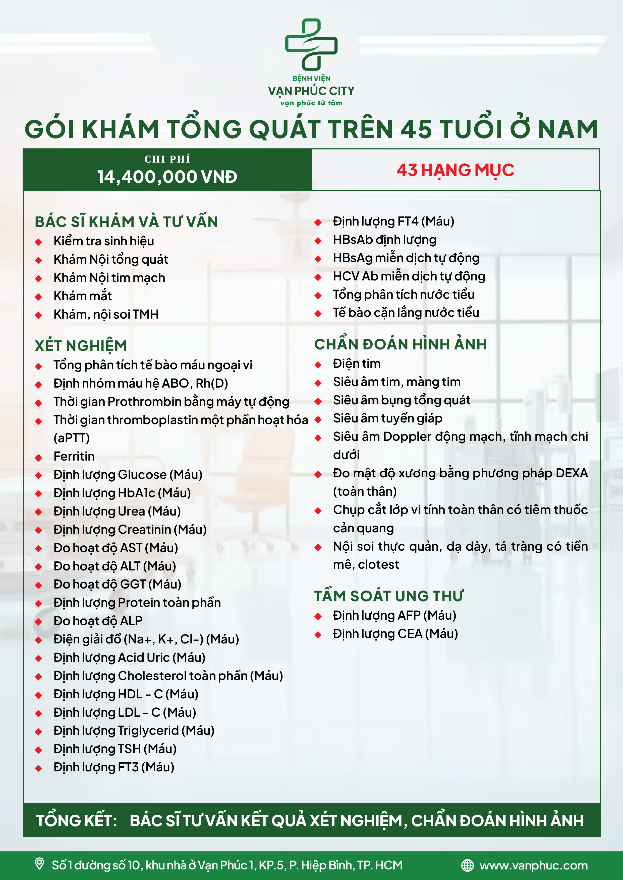 👉 Gói khám tổng quát tại Bệnh viện Vạn Phúc City được thiết kế toàn diện giúp nam giới sau độ tuổi 45 chủ động kiểm soát sức khỏe một cách tốt hơn, duy trì thể lực – trí lực ổn định để sống khỏe mỗi ngày.