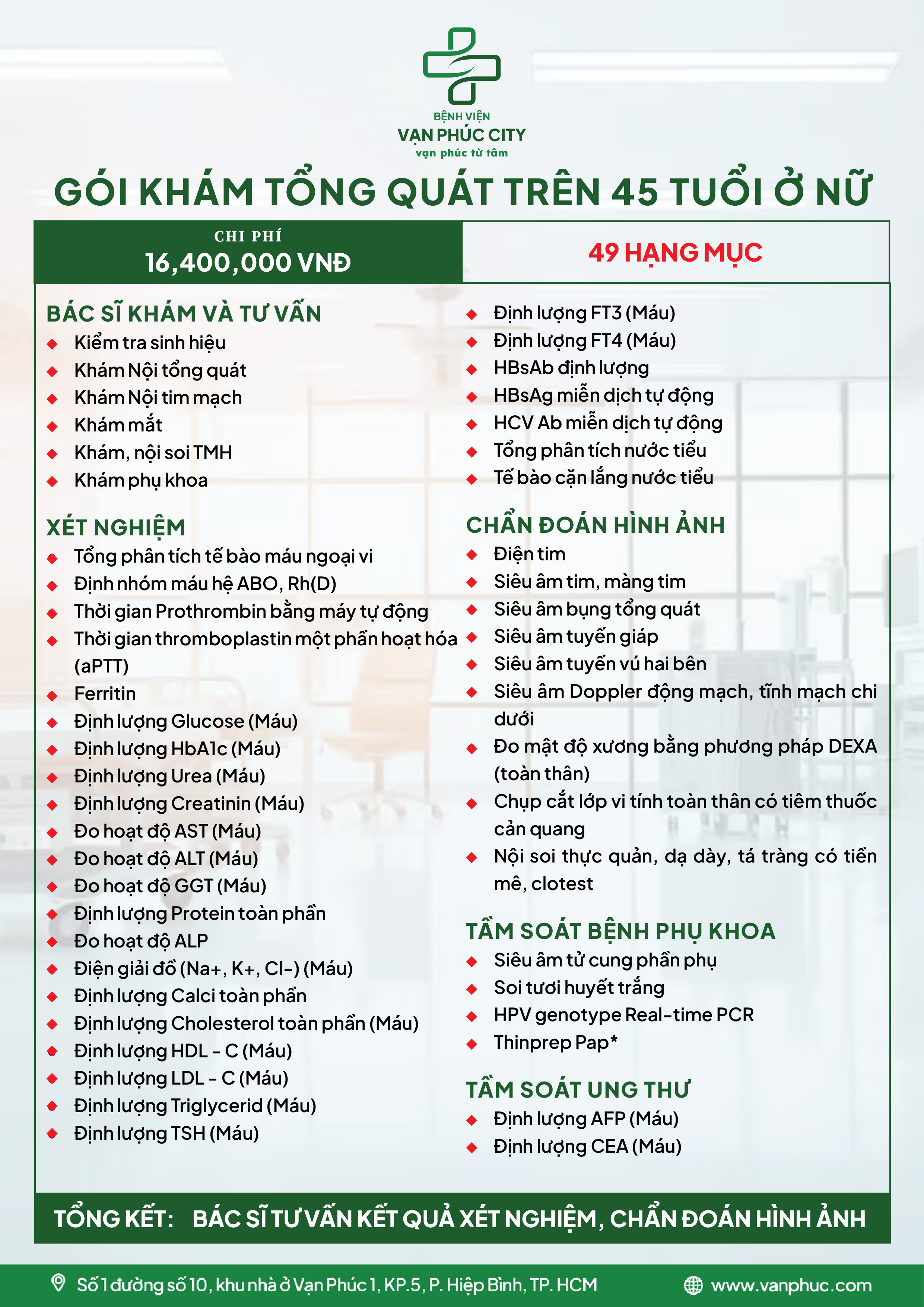 3. Chi tiết gói khám tổng quát trên 45 tuổi ở Nữ tại Bệnh viện Vạn Phúc City