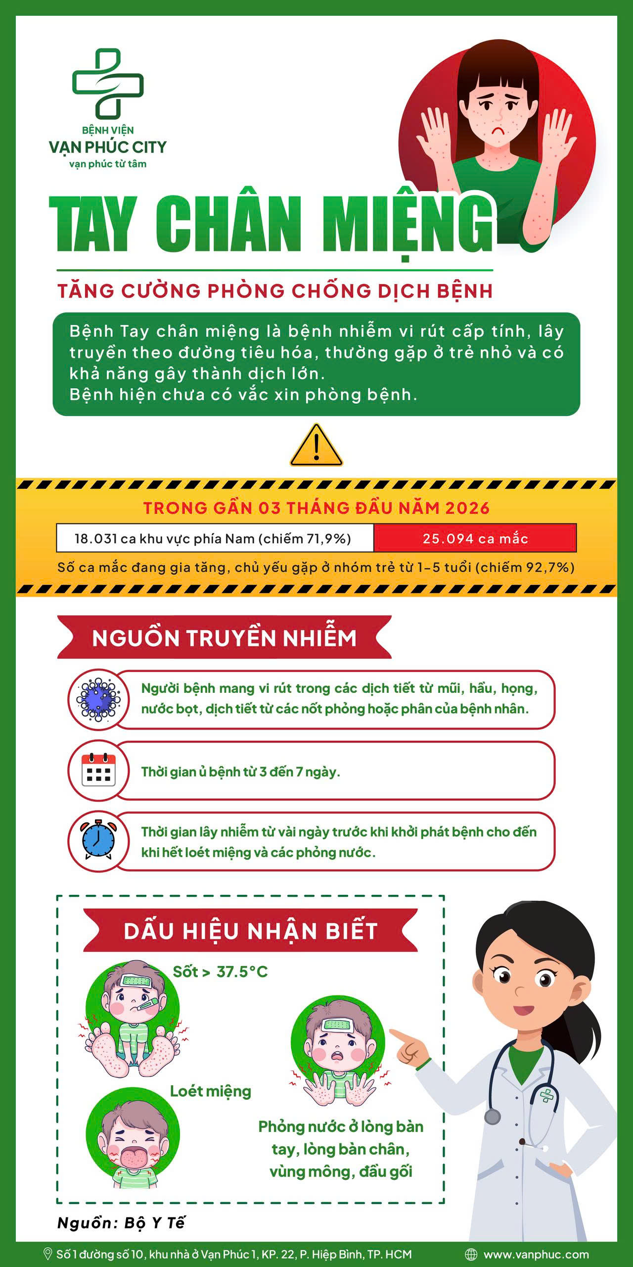 🔎 Theo thống kê từ Bộ Y tế, trong gần 03 tháng đầu năm 2026, cả nước đã ghi nhận 25.094 trường hợp mắc, trong đó có 4 ca tử vong. Riêng khu vực phía Nam chiếm 71,9% (với 18.031 ca mắc) , và phần lớn phát hiện ở bệnh nhi từ 1–5 tuổi (92,7%) – độ tuổi hệ miễn dịch còn non yếu và chưa có ý thức tự bảo vệ.