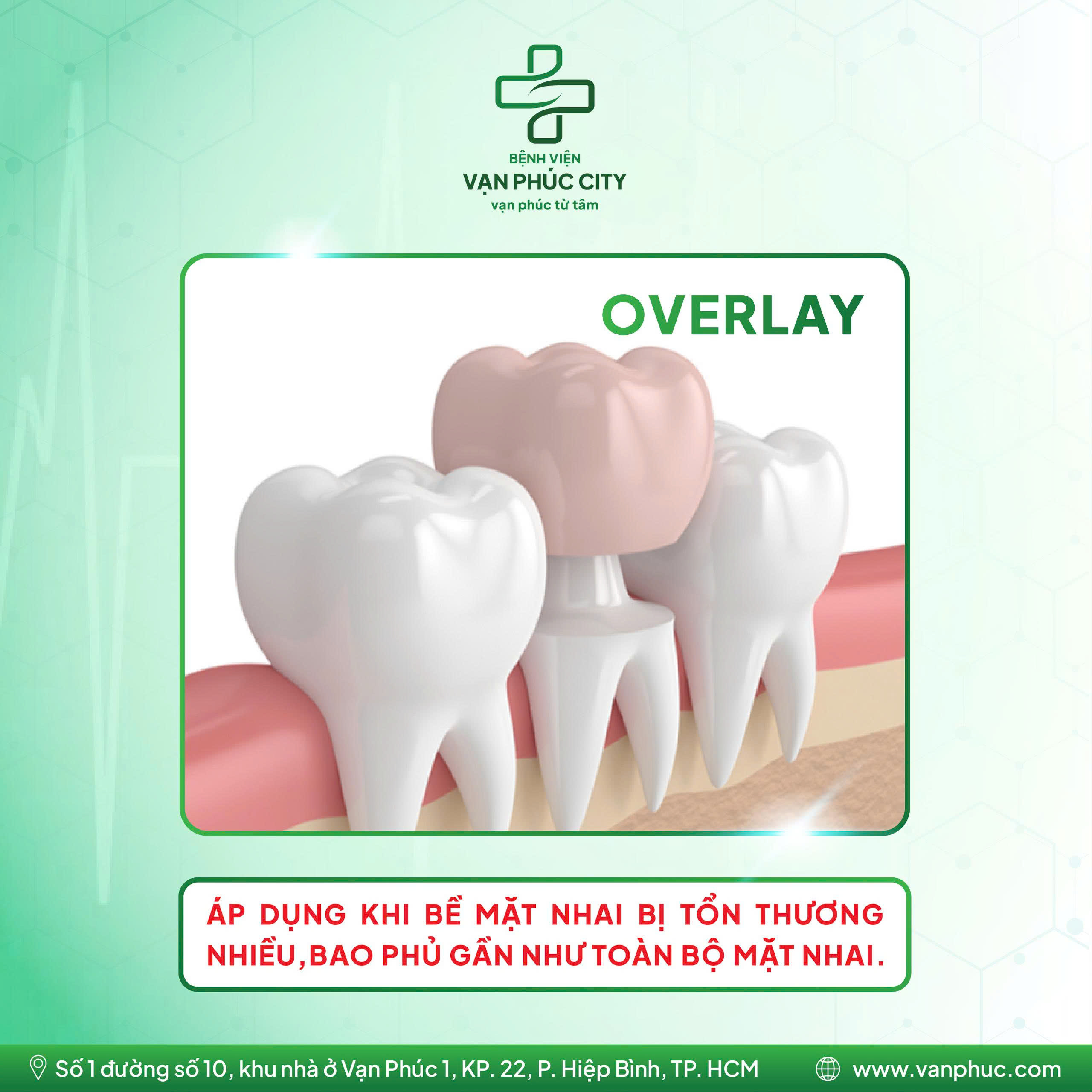 🔍 Overlay: Được sử dụng khi bề mặt nhai bị tổn thương nhiều. Lúc này, lớp phục hình sẽ bao phủ gần như toàn bộ mặt nhai, giúp phân bố lực đều hơn và giảm nguy cơ nứt vỡ răng.
