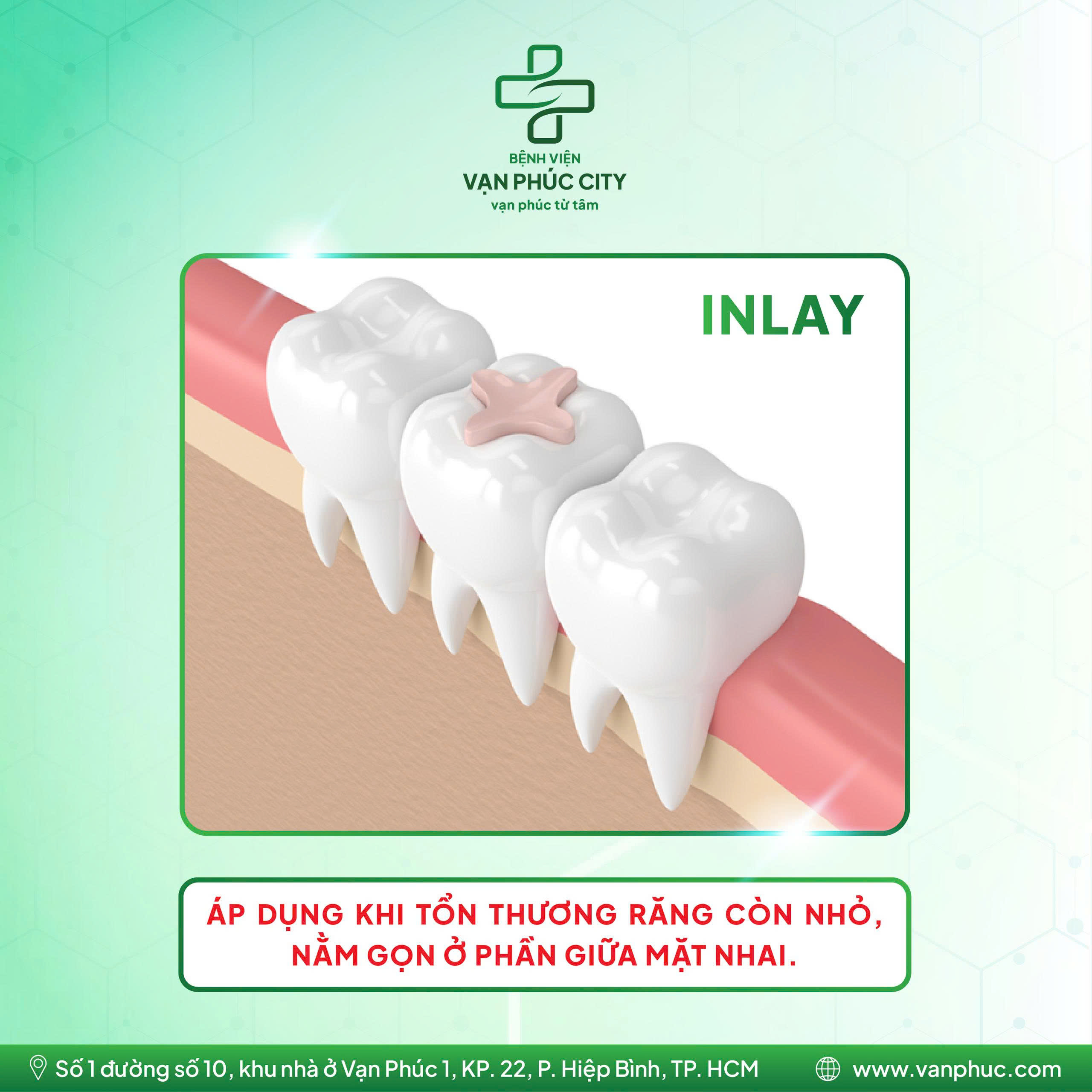 🔍 Inlay: Áp dụng khi tổn thương răng còn nhỏ, nằm gọn ở phần giữa mặt nhai. Miếng phục hình lúc này chỉ “lấp đầy” vùng bị khuyết, không ảnh hưởng đến các múi răng xung quanh.