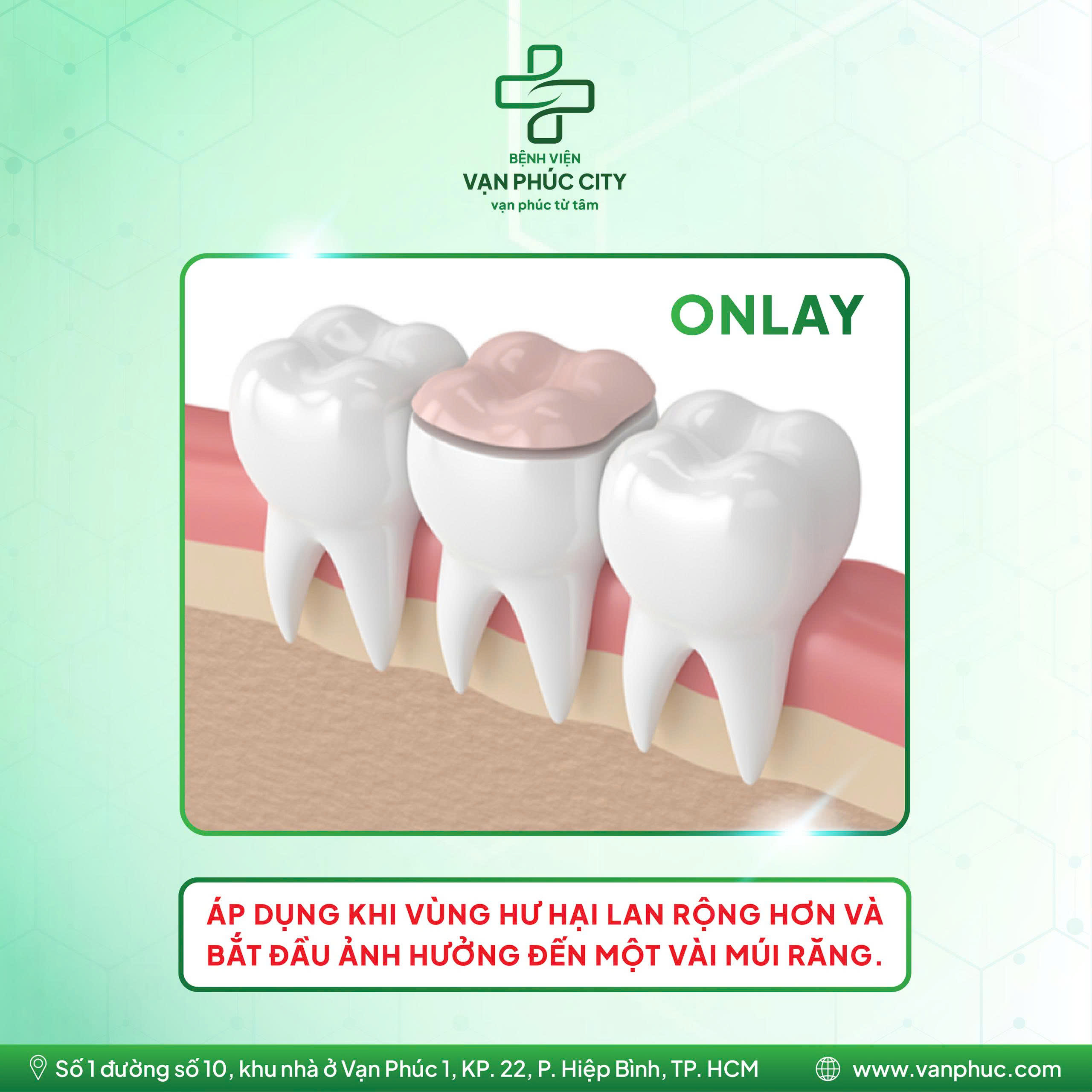 🔍Onlay: Được chỉ định khi vùng hư hại đã lan rộng hơn và bắt đầu ảnh hưởng đến một vài múi răng. Ngoài việc bù đắp phần mất đi, onlay còn giúp gia cố những vùng răng yếu, hỗ trợ chịu lực khi ăn nhai.